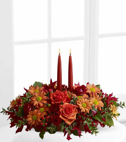 Description: Let Autumn lights glow at your Thanksgiving feast, and the holiday spirit will shine! Adorn the table with this lovely floral arrangement of roses, daisy spray chrysanthemums and oak leaves arranged around two tall orange tapers, and dazzle family and friends. A wonderful gift for a hostess, or as a centrepiece for your own celebration.