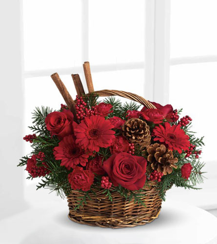 Description: Berries and spice and everything nice make this beautiful flower arrangement a wonderful holiday gift. Festive red roses, gerberas, carnations and berries are arranged to look their holiday best when mixed with cinnamon sticks and pinecones in a lovely wicker basket. What a charming holiday surprise.
