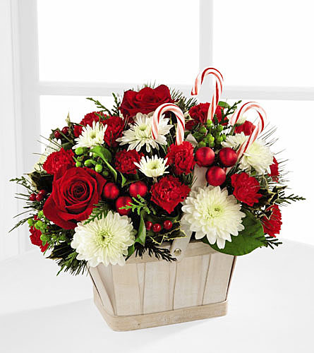 Description: The Candy Cane Lane Bouquet is a festive and fun way to celebrate the arrival of the holiday season. Bright red roses and mini carnations are offset by snowy white chrysanthemums and assorted holiday greens, beautifully arranged in a white wash basket and accented with three candy canes to offer holiday joy and cheer to your special recipient.