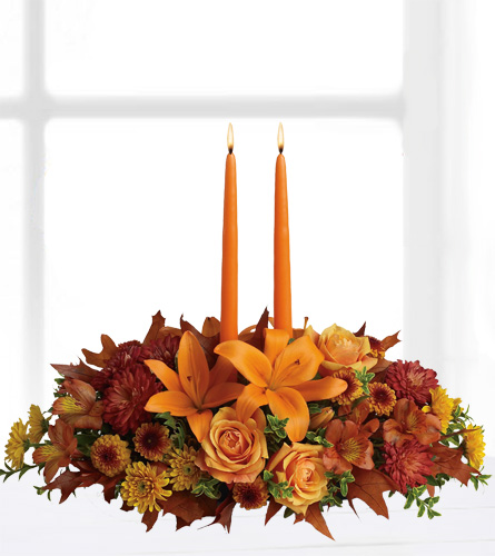Description: As your loved ones gather around the table, they'll bask in the warm glow of two orange taper candles surrounded by a fantastic array of fall flowers. Orange roses, Asiatic lilies, dark orange alstroemeria, bronze chrysanthemums, yellow and rust cushion spray mums and fall foliage are exquisitely gathered in this centre-of-attention piece.