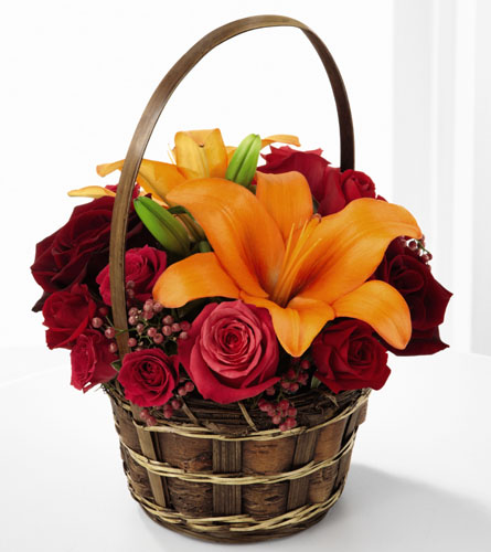 Description: The Harvest Blooms Basket exudes radiant colour and happy wishes for a fantastic Fall season. Dark red roses and spray roses, fuchsia roses and spray roses, bright orange Asiatic Lilies and pepperberry stems are gorgeously situated in a round brown basket to create an inspirational arrangement of Autumn wonder that will spread warmth and joy.
