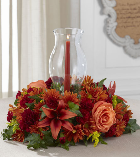 Description: The Heart of the Harvest centrepiece exudes warmth and autumn elegance to create the perfect addition to their fall table. Orange roses, burgundy carnations, rust Asiatic lilies, burgundy mini carnations, bronze traditional daisies, yellow solidago and lush greens are beautifully arranged to surround a clear glass hurricane holding a single burgundy taper candle to create an eye-catching centrepiece. set to bring colour, life and light to your special recipient's gathering, this fresh floral centrepiece will create an excellent Thanksgiving gift.