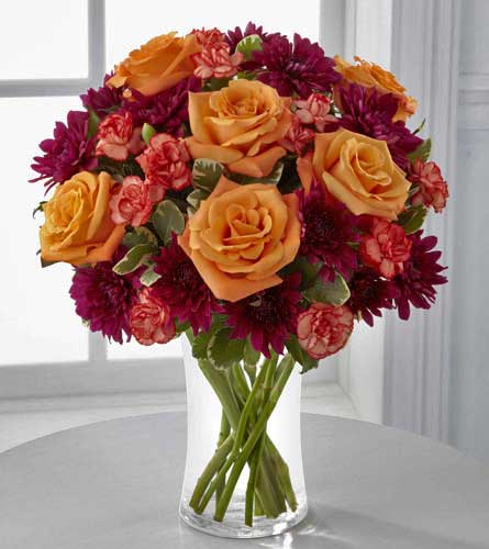 Description: The Autumn Treasures Bouquet is a floral fantasy of fall colour displayed in eye catching jewel tones. Brilliant orange roses and orange mini carnations are accented with burgundy chrysanthemums and lush greens arranged to perfection in a classic clear glass vase to create a warm and dazzling way to send your best wishes for a beautiful harvest season.