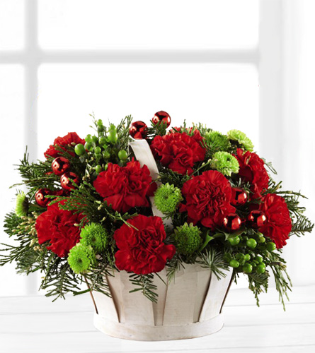 Description: Taking traditional Christmas colours and turning up the volume to create a bright and festive arrangement, this fresh flower bouquet is ready to bring holiday joy to the special people in your life. Rich red carnations are accented with green hypericum berries, green button poms and clusters of shining red glass holiday balls are arranged with fragrant holiday greens in a white handled basket.